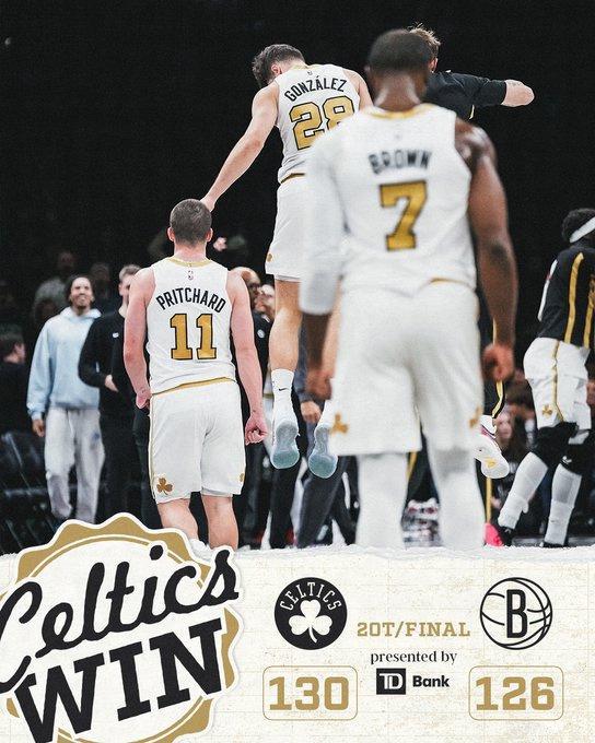 進入第二個加時賽比拼,布朗連續沖擊內線得分,波特也接連得分緊咬比分。普里查德上籃擴大4分優勢,籃網接連出現失誤,凱爾特人保持微弱領先優勢,最終凱爾特人雙加時130-126險勝籃網。